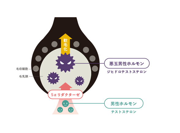 - 男性ホルモン(テストステロン)が、抜け毛の原因とされるDHT(ジヒドロテストステロン)に変換されることを阻止することで、脱毛の進行を止めるお薬です。