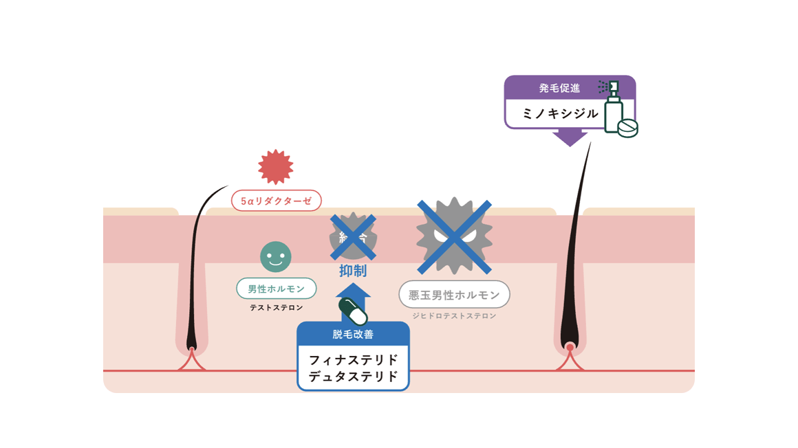 - 男性ホルモン(テストステロン)が、抜け毛の原因とされるDHT(ジヒドロテストステロン)に変換されることを阻止することで、脱毛の進行を止めるお薬です。フィナステリドよりも効果が高いです。